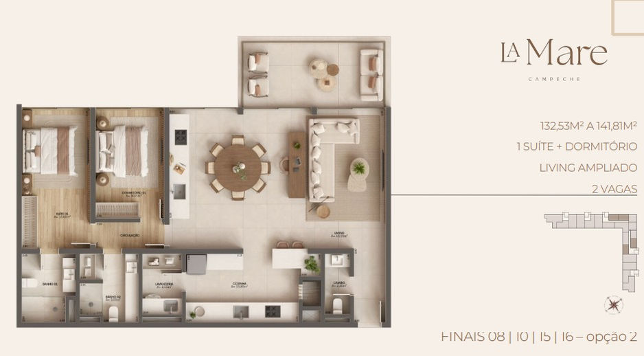 o La Mare chega para redefinir o viver no Campeche. Com um terreno de 12.000 m², o projeto se destaca pela arquitetura contemporânea, plantas flexíveis de 2 a 5 suítes com até 362 m² e 80% das unidades com vista permanente para o mar.